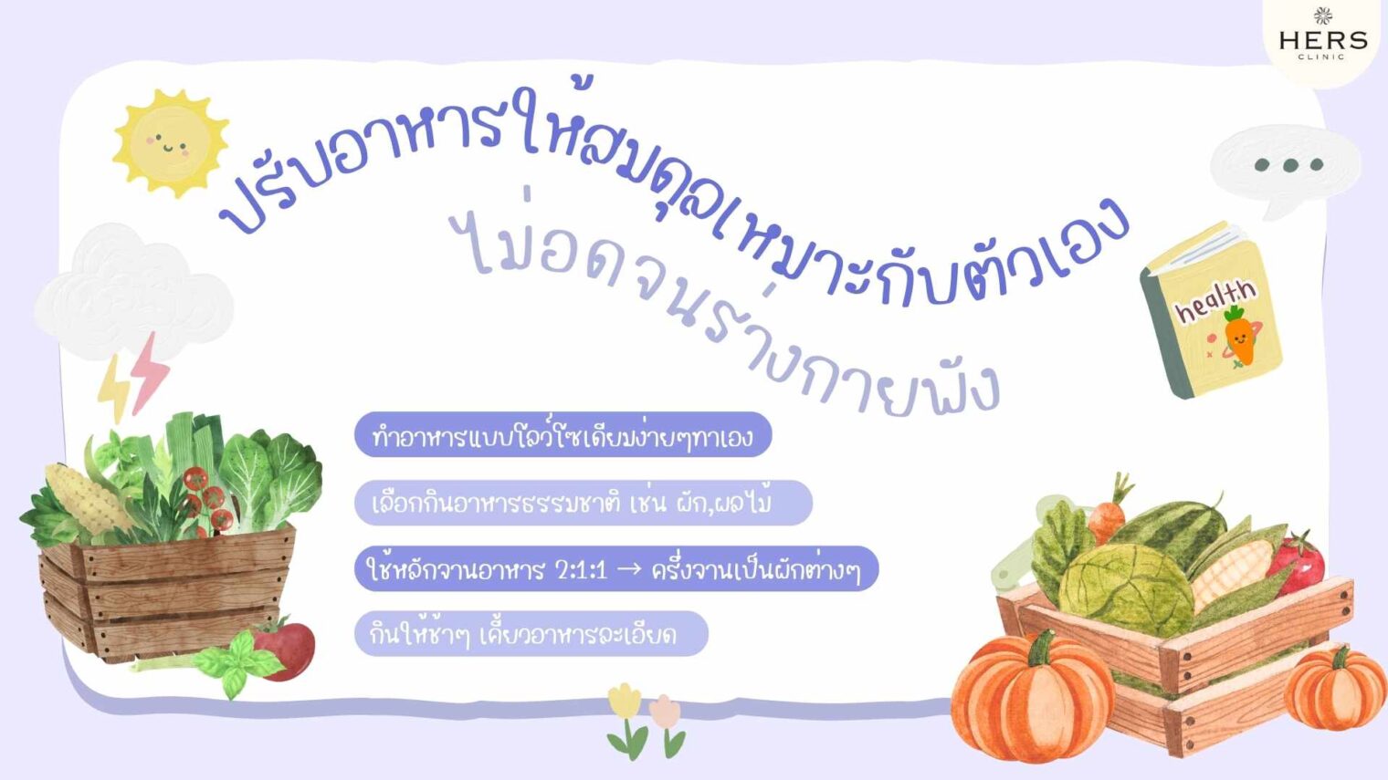 - ใช้หลักจานอาหาร 2:1:1 → ครึ่งจานเป็นผักต่างๆ, 1 ส่วนเป็นโปรตีน เนื้อสัตว์, 1 ส่วนเป็นคาร์โบไฮเดรตที่ดี เช่น ข้าวกล้อง มันเทศ